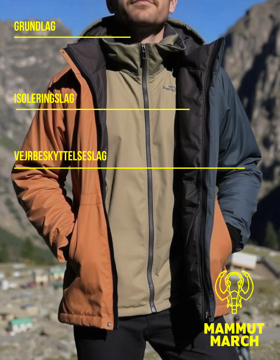 - Det yderste lag beskytter dig mod vind og vejr. Her bruges vandtætte og vindafvisende jakker. Sørg for, at jakken er åndbar for at forhindre, at der opbygges varme.